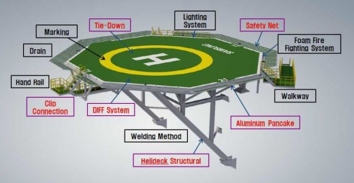 NK의 HELIDECK는 기존 HELIDECK와는 차별화된 구조 설계와 초대형 사이즈를 가장 큰 특징으로 가진다. 기존 구조보다 더 단순한 형태인 컨틸레버(Cantilever) 구조에 알루미늄 합금 소재를 사용함으로써 약 30%의 구조 경량화를 실현하였다.